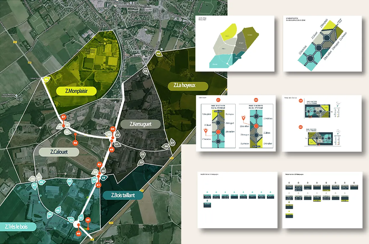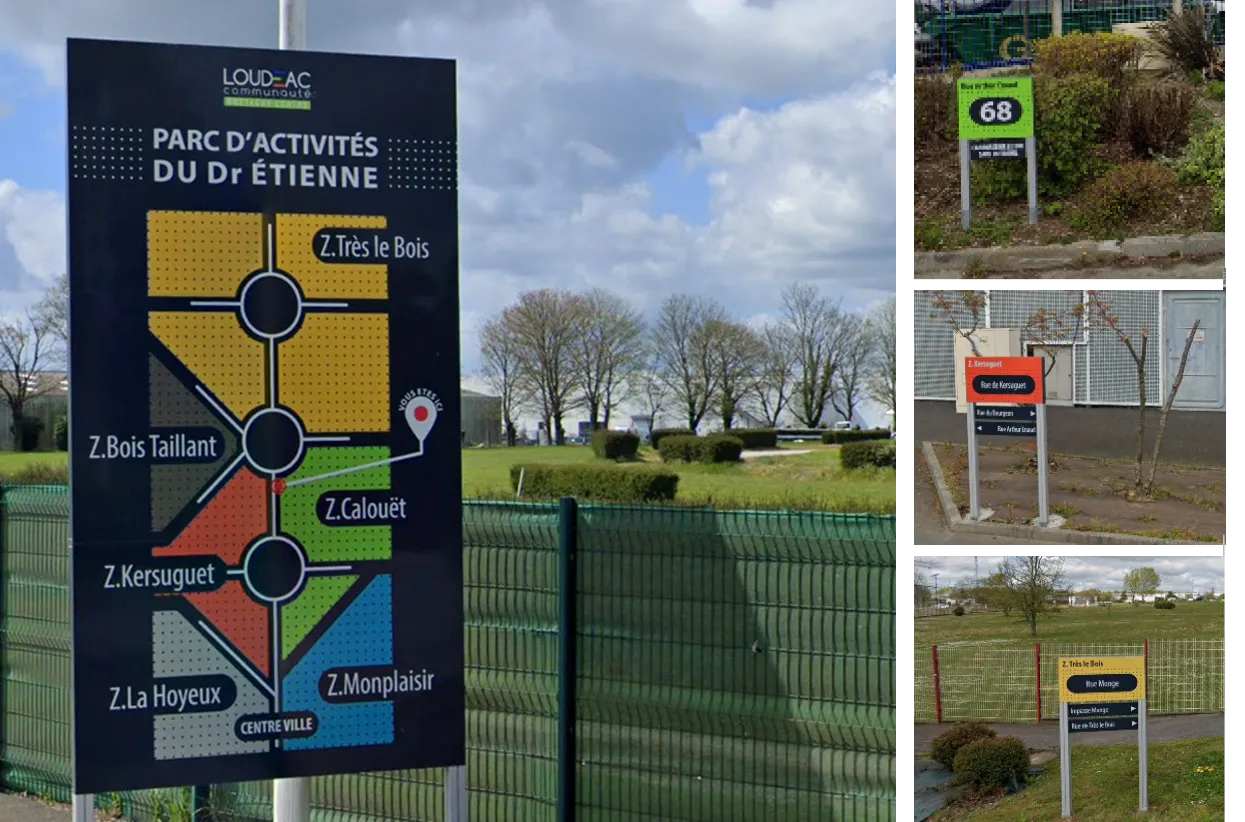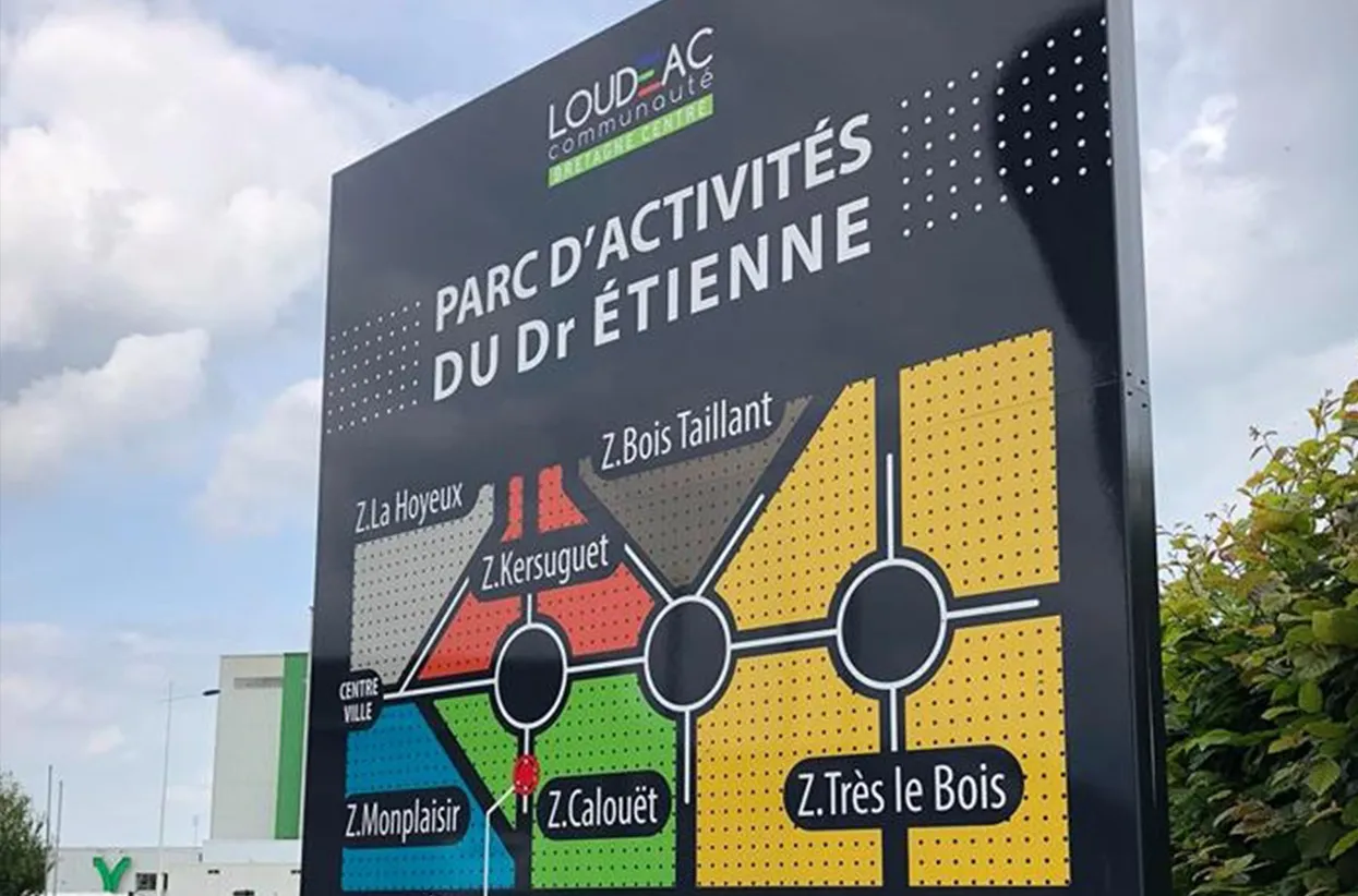 Le Parc d’Activités du Dr Étienne à Loudéac, géré pour la CIDERAL, s’étend sur plus de 400 hectares et accueille plus d’une centaine d’entreprises, faisant de lui une véritable « plaque tournante » en centre Bretagne. L’étude signalétique a permis de développer un concept de jalonnement structuré, basé sur un découpage précis de la zone, une codification graphique cohérente et une progression de l’information, allant des indications générales vers des informations de plus en plus détaillées à mesure que l’usager progresse dans le parc.