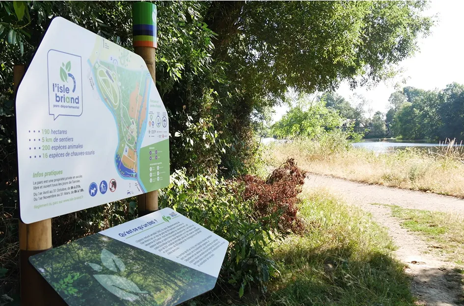 La gestion et la mise en valeur de l’Isle Briand s’inscrivent dans une logique de préservation mais aussi de partage : ce patrimoine doit être protégé, tout en étant rendu lisible et accessible aux différents publics. C’est dans ce cadre qu’une étude de signalétique complète a été engagée, afin de répondre à un double objectif : accompagner et guider les visiteurs dans leurs parcours, tout en proposant une véritable médiation culturelle et scientifique adaptée aux différents types de publics autour des richesses naturelles du site.
